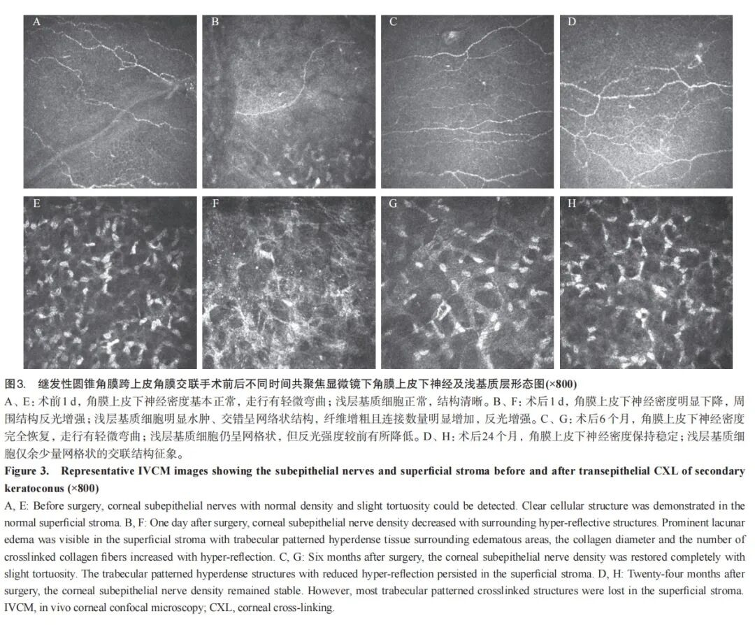 最终纳入患者31例(54眼),年龄(28.1±1.2)岁。在角膜交联术前以及术后3、6、12、24个月,术眼的裸眼视力、最佳矫正视力、球镜度、柱镜度、K1、K2、最大角膜曲率、角膜最薄处厚度、眼压等的差异均无统计学意义(均P>0.05)。术后1 d时11眼(11/54,20%)可见角膜上皮缺损,均在术后1周内修复;术后2周时8眼(8/54,15%)可见浅层基质交联分界线,深度约200 μm。活体角膜共聚焦显微镜下见术后1 d时角膜上皮下神经纤维密度较术前下降(P<0.001),浅层基质细胞水肿、交错呈网格状;术后3个月时神经纤维密度仍低于术前(P=0.001),浅层基质纤维可见网格状的强反射交联结构;术后6、12、24个月时神经纤维恢复至术前水平(P>0.05),但术后12、24个时浅层基质高反射网状结构较前明显减少。各随访时间点角膜内皮细胞密度无明显变化(F=0.39,P=0.642)。