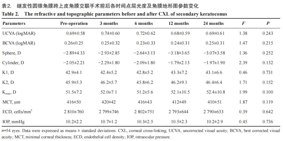 角膜屈光术后继发性圆锥角膜患者在接受高能量快速跨上皮角膜交联术后2年内屈光状态及角膜地形图参数均保持稳定,且无明显并发症。