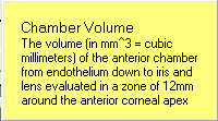 前房容积,从角膜内皮往下到虹膜和晶体之间,以前角膜顶点为中心12mm范围内的体积【单位:立方毫米】。