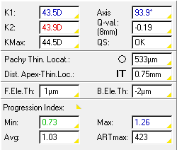 - Belin/Ambrosio Enhanced Ectaia: Progression index,Min,max,CTSP,PTI,Df,Db,Dp,Dt,Da,D