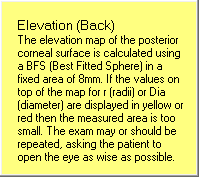 高度图。高度图是用最佳拟合球面在8mm固定区域计算得来。如果在图上方用r(radii)或Dia(diameter)表示的数值显示黄色或红色,表示检测面积太小,应该重新检测,并告诉患者把尽量睁大。