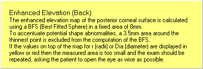 增强高度图。增强高度图是用最佳拟合球面在8mm固定区域计算得来。为了突出潜伏的形态异常,BFS计算时排除了以角膜最薄点为中心3.5mm的区域。如果在图上方用r(radii)或Dia(diameter)表示的数值显示黄色或红色,表示检测面积太小,应该重新检测,并告诉患者把尽量睁大。